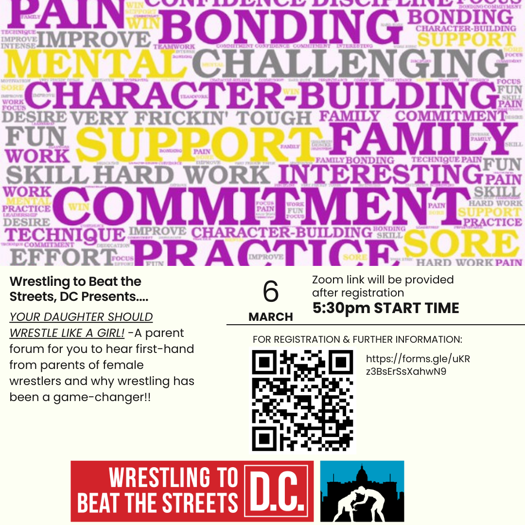 Women's Advocate for Wrestling to Beat the Streets, DC (https://www.wrestlingbts-dc.org/). is hosting a forum on Zoom on March 6 at 5:30 pm for prospective girl wrestlers.