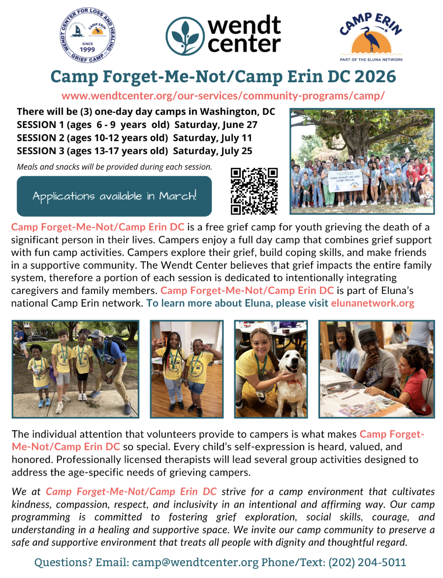 We are so grateful for our partnership with the Wendt Center. The Wendt Center is offering Camp Forget Me Not/Camp Erin this summer which is a free grief camp for students grieving the death of a significant person in their lives.