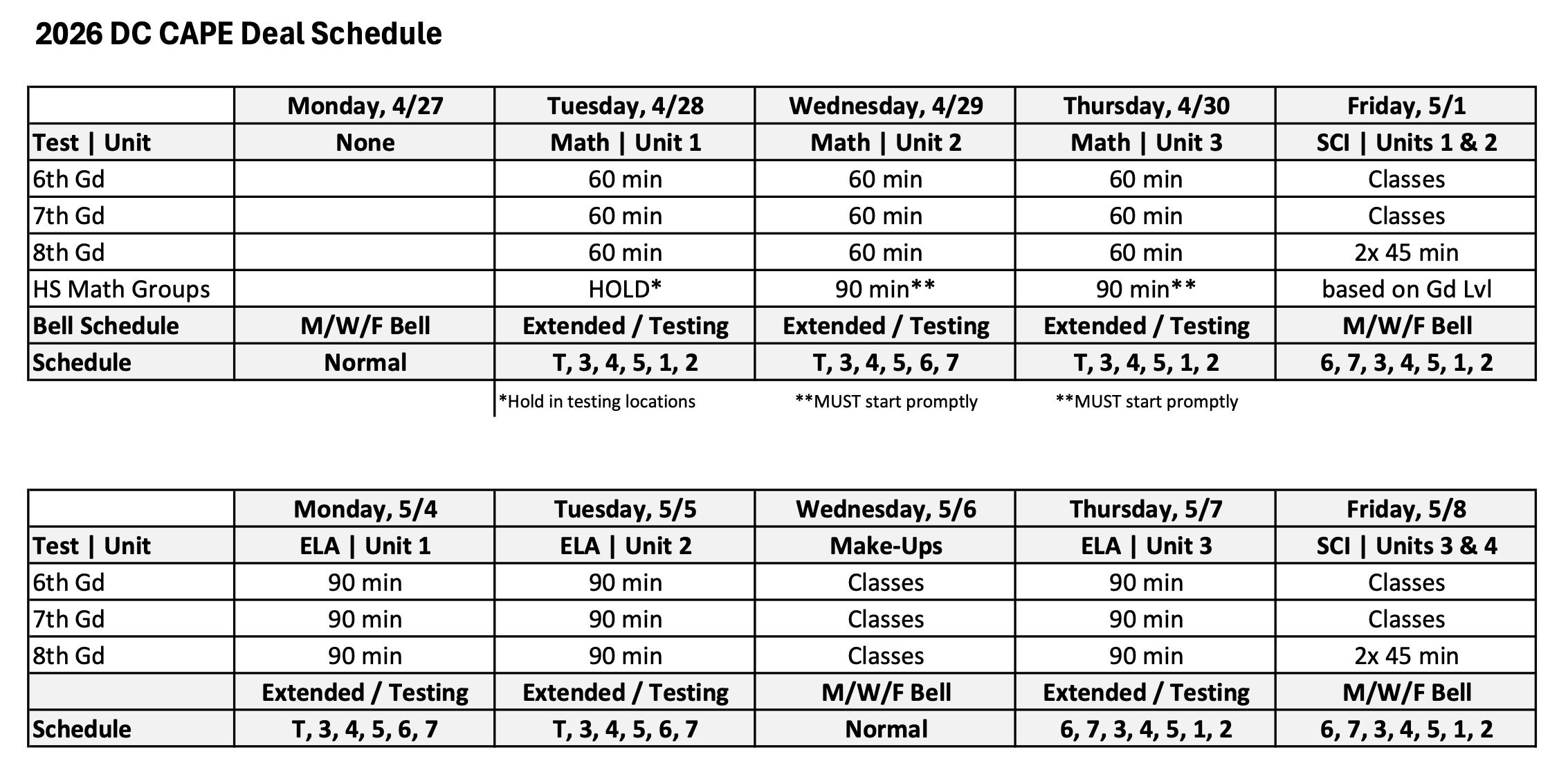 Deal families are asked to learn more about DC CAPE by watching a short video. This 10-minute video covers helpful details about the test's content, format, dates, and ways to help your student prepare at home.